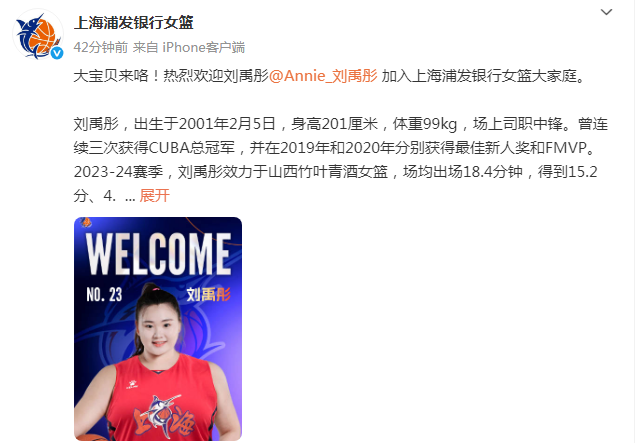 上海女篮官宣:大宝贝刘禹彤加盟 两届全明星新赛季继续穿23号